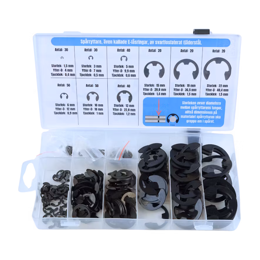 Med vår sortimentsats står du väl rustad i alla lägen då den innehåller hela 300 spårryttare i storlekar från Ø 1,5 mm till Ø 22 mm. Storleken avser diametern mellan spårryttarens tungor, alltså dimensionen på materialet spårryttaren ska greppa om (i spåret), se bilden nedan. För exakta dimensioner, se specifikation på insidan av sortimentlådans lock (eller sista produktbilden här ovanför).