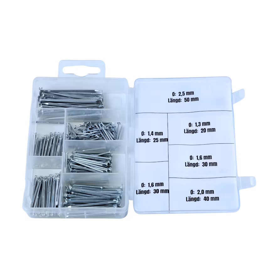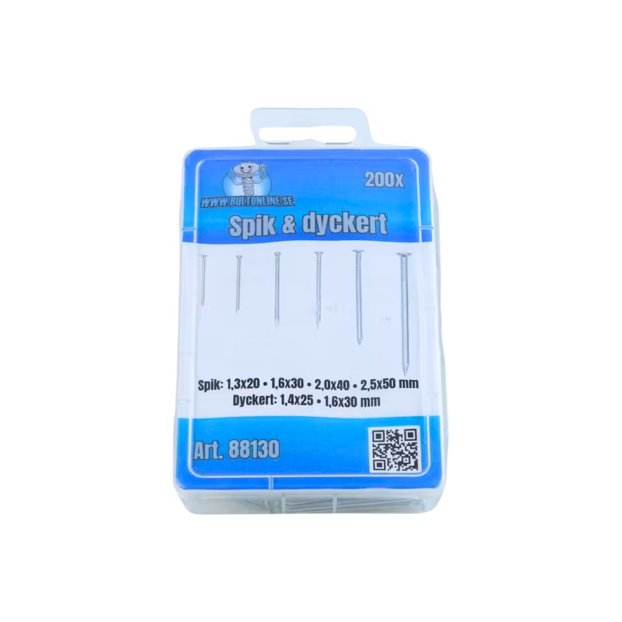 Här är ett praktiskt litet sortiment med spik och dyckert i olika storlekar.