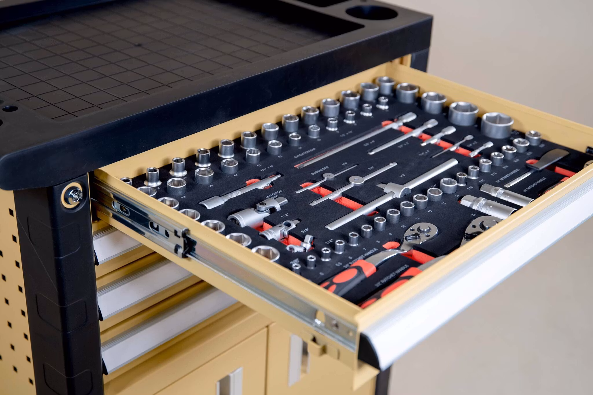 Lådorna innehåller fyra olika verktygssatser innehållande 135 delar som går att möblera om efter tycke och smak. Verktygen av kromvanadinstål är snyggt sorterade i skumgummi-inlägg med bestämd plats och uppmärkning för varje verktyg, vilket skapar ordning och reda. Vagnen har en stilsäker design i gulbeige (RAL1002) och svart (RAL 9005) som ger ett tilltalande intryck i varje verkstad eller garage.