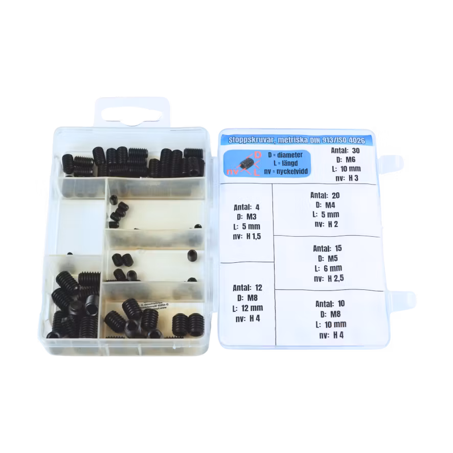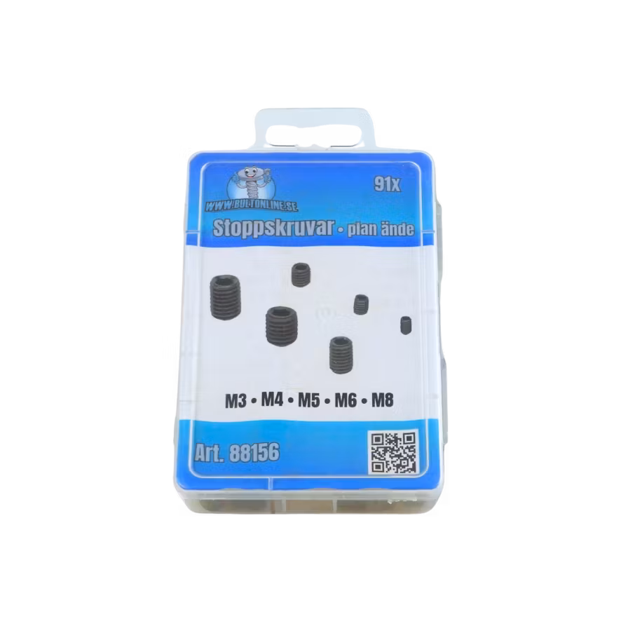 91 stycken stoppskruvar med plan ände i metriska dimensioner enligt standarder DIN 913 / ISO 4026.