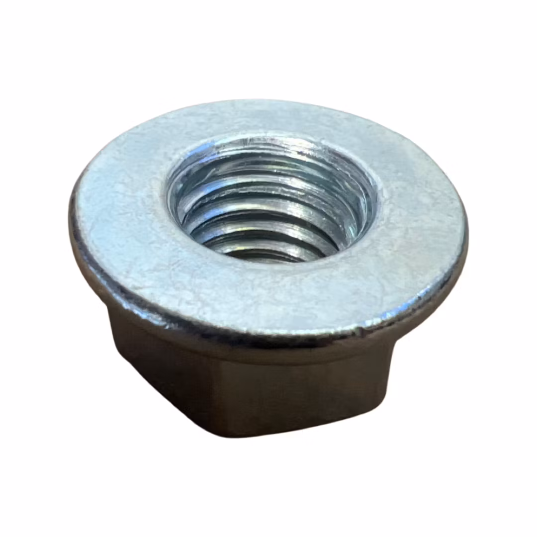 En blankförzinkad sexkantmutter med slät fläns enligt ISO 4161/DIN 6923.