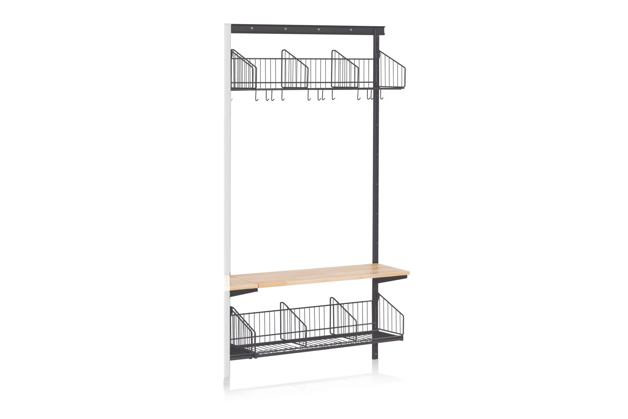 Vägghängd sko- och hatthylla inklusive sittbänk (tilläggssektion) för förvaring av kläder och skor. Hyllan går att bygga ut med fler sektioner till ett helt hyllsystem som både har stort förvaringsutrymme och är platsbesparande. Perfekt för att skapa funktionella förvaringslösningar för exempelvis kapprum. Sko- och hatthyllan har tre fack vardera och en dropplåt som samlar upp smuts.