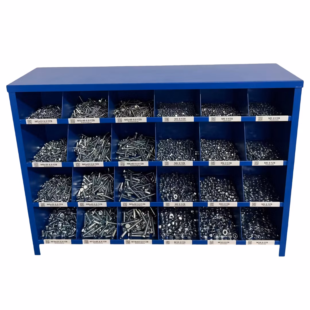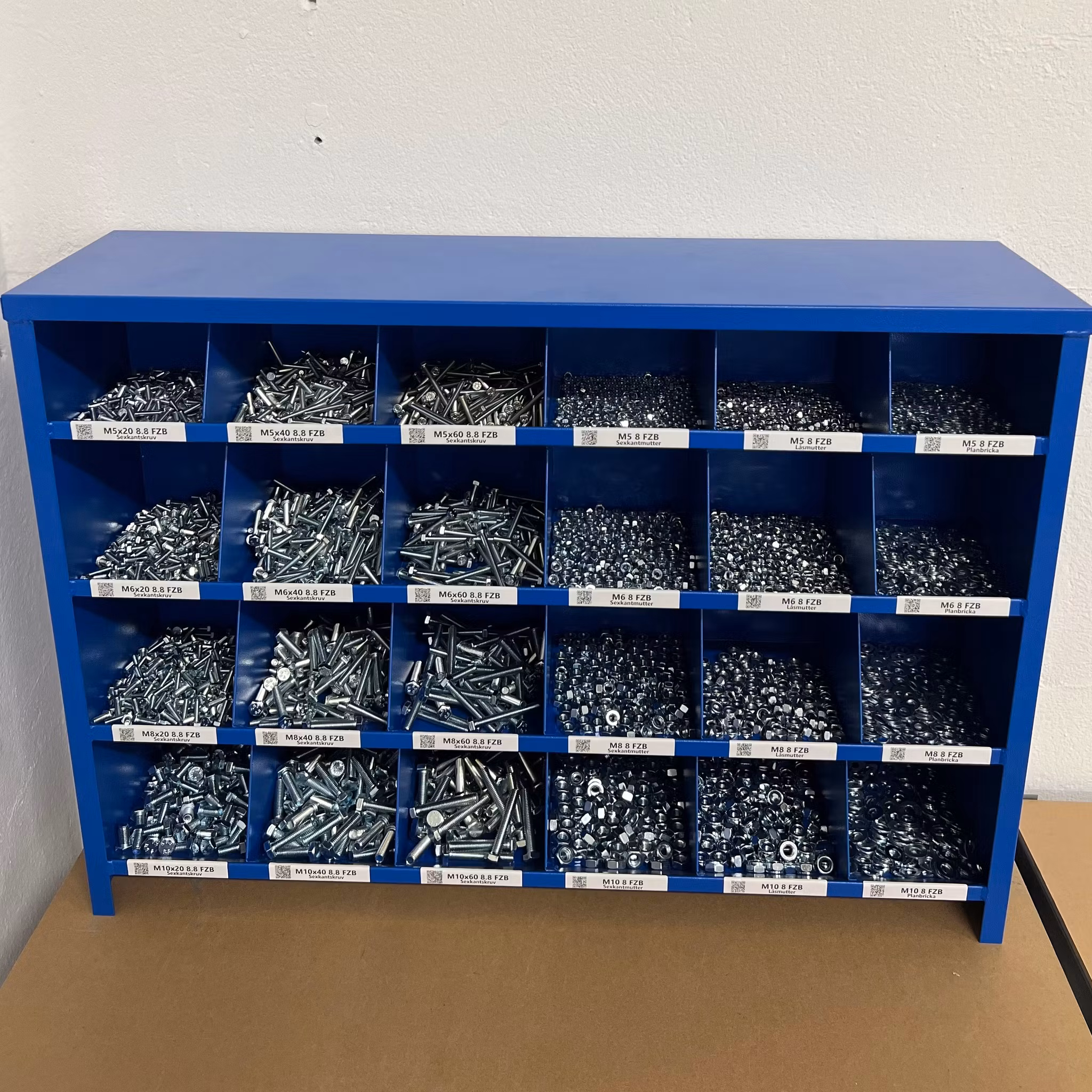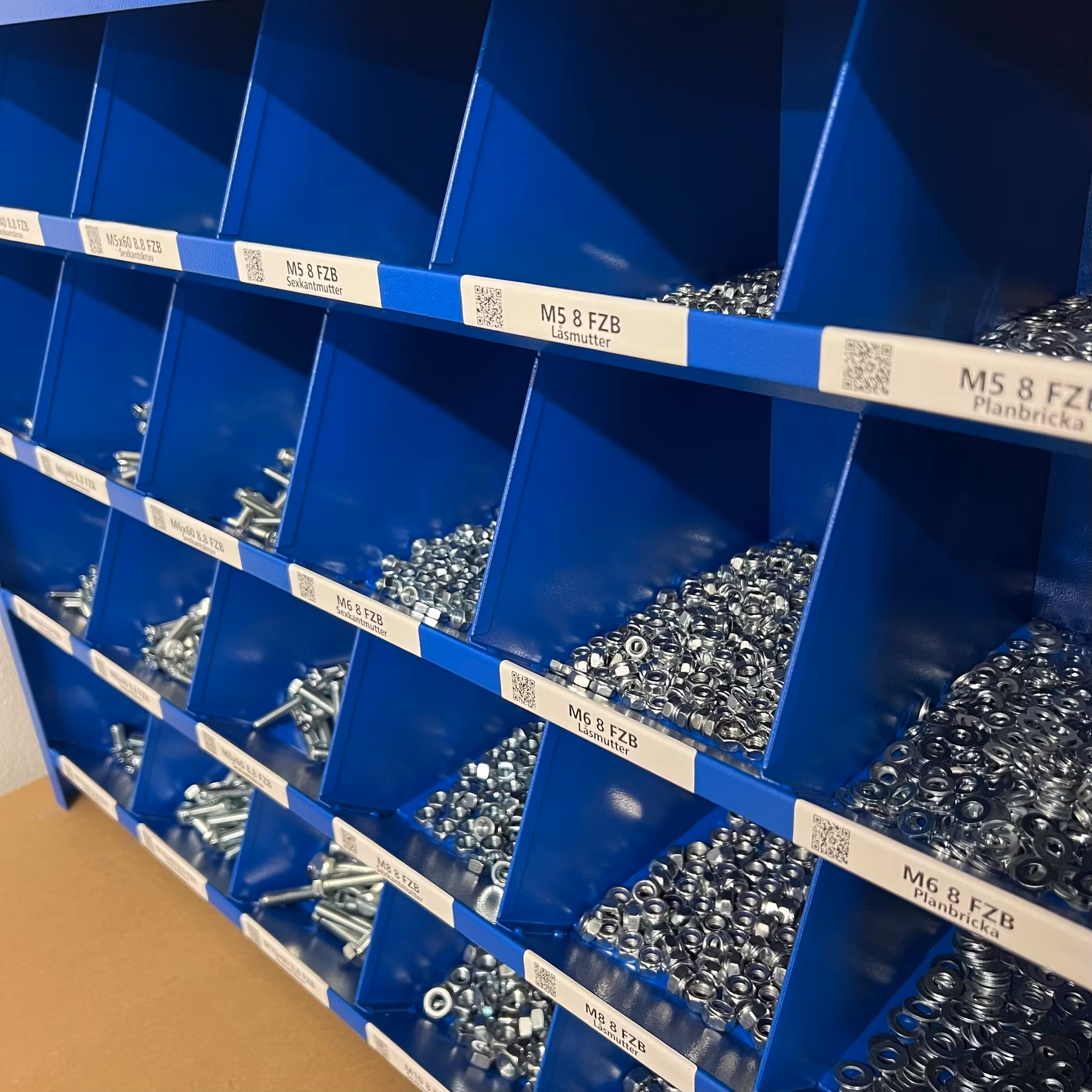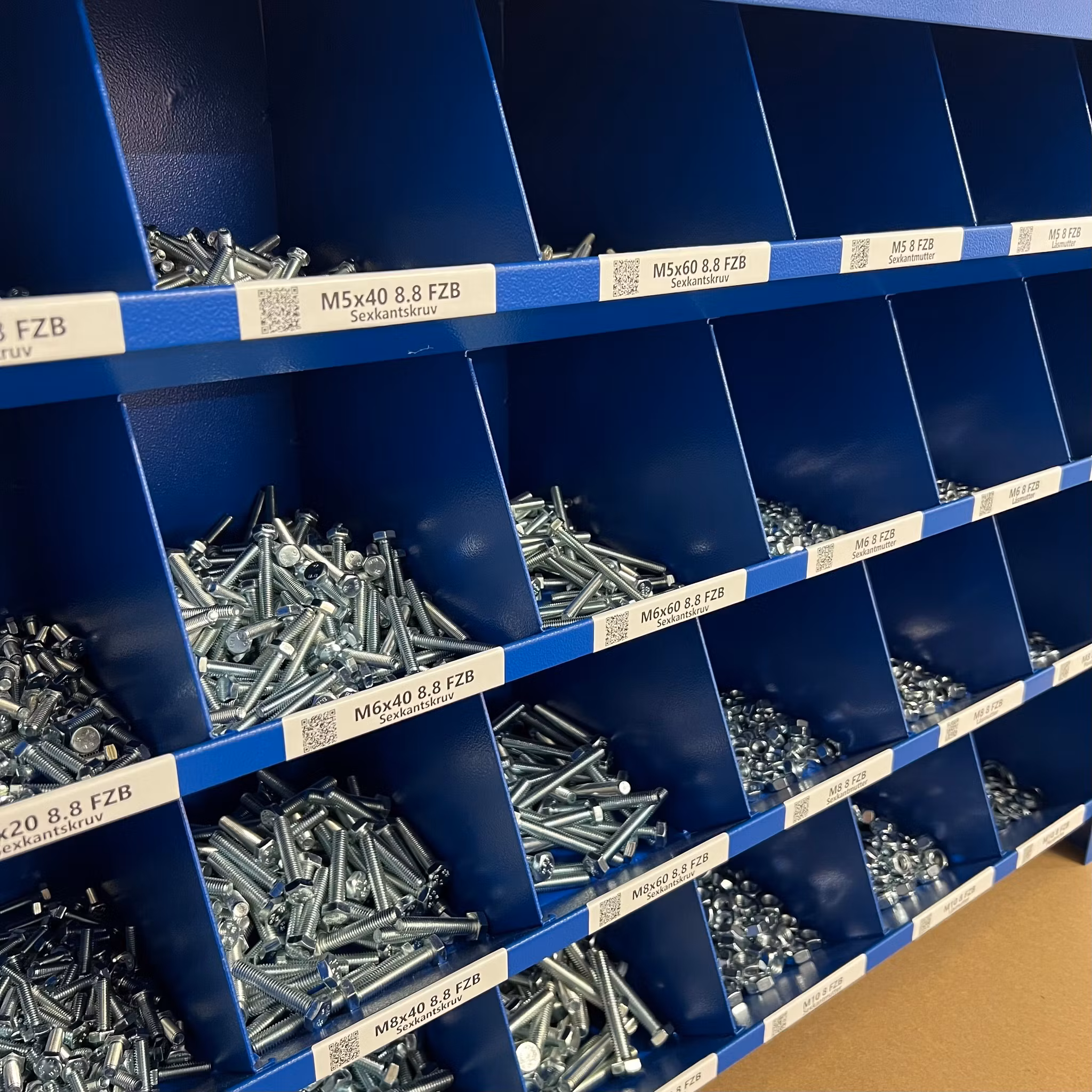 En av de smarta funktionerna med Bultfack är QR-koden som sitter på varje etikett. Denna kod ger dig möjligheten att med en enkel skanning komma direkt till en specifik skruv eller komponent på vår hemsida. Här kan du läsa mer om produkten, jämföra alternativ eller beställa nya delar för att fylla på ditt lager.