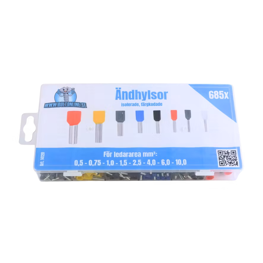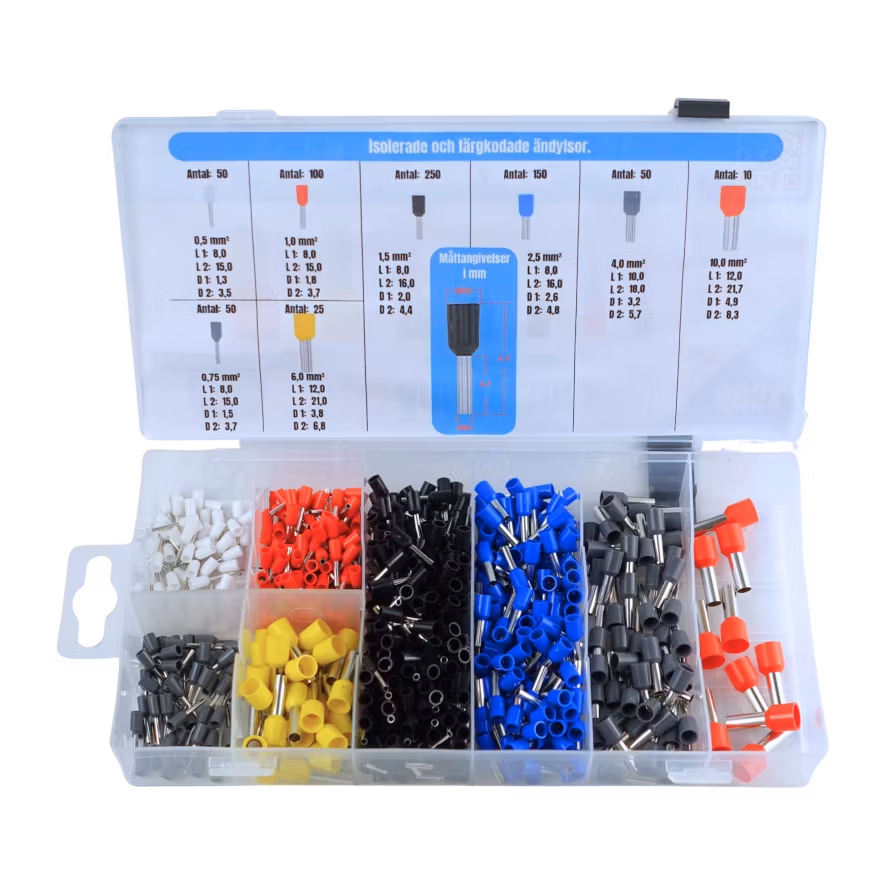 Detta set med isolerade ändhylsor är perfekt att ha i garaget för allehanda elektroniska projekt. Ändhylsor används för att avsluta och skydda änden på en flertrådig ledare genom att pressas fast (krimpas) med en särskild tång för att ge en stabil och pålitlig elektrisk anslutning.