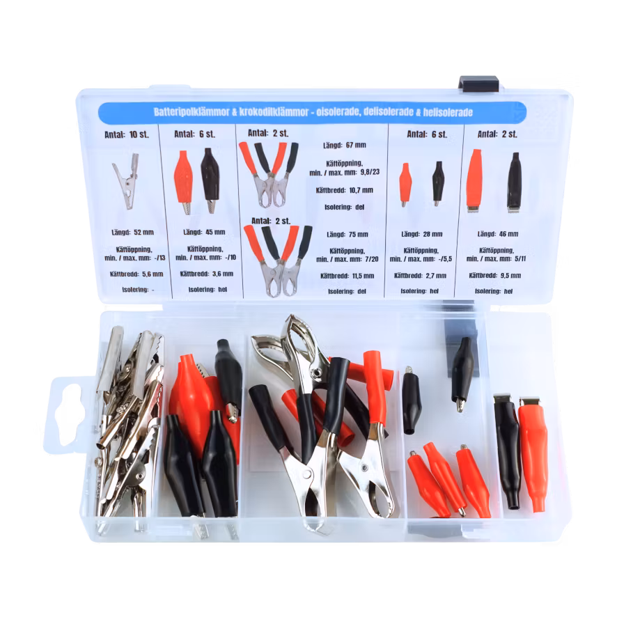 Detta set med oisolerade, delisolerade och helisolerade batteripolklämmor och krokodilklämmor är perfekt att ha i garaget för allehanda elektroniska projekt.