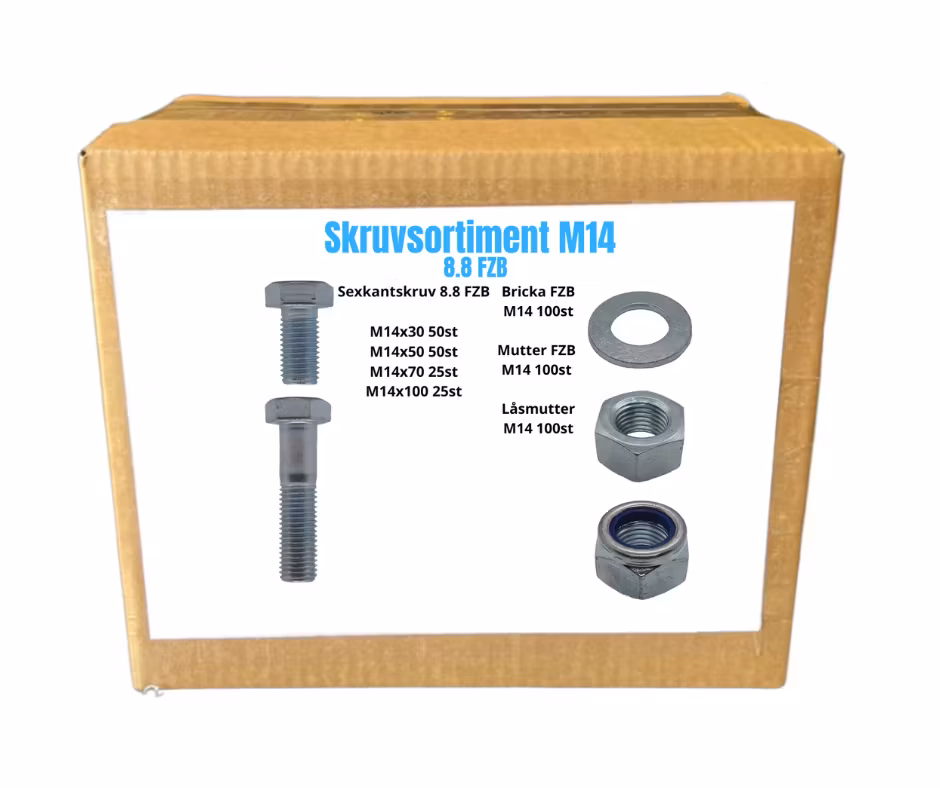 Det är ett utmärkt sortiment som består av 450 delar blankförzinkad del- och helgängad sexkantskruv (ISO 4014/4017), sexkantmuttrar (ISO 4032), sexkantlåsmuttrar (DIN 985) samt runda planbrickor (ISO 7089/DIN 125) i dimensionerna M14.