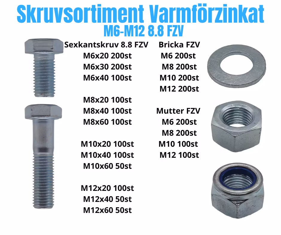 Det är inte för inte som Bultsortimentet FZV har blivit ett av våra mest populära sortiment, då ett bättre instegssortiment som passar både verkstäder och hemmafixare är svårt att hitta! Detta sortiment består av 2 350 delar varmförzinkad sexkantskruv (ISO 4014), sexkantmuttrar (ISO 4032), samt runda planbrickor (ISO 7089/DIN 125) i dimensionerna M6 → M12.