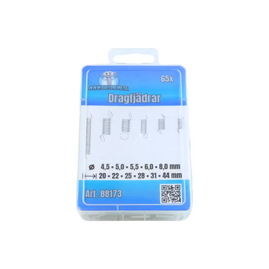 Vår lilla sortimentsats med dragfjädrar är ett praktiskt grundsortiment att ha till hands. Det innehåller 65 fjädrar i olika dimensioner.