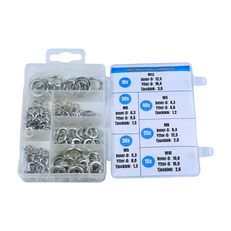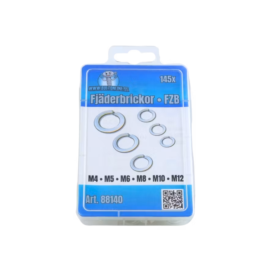Blankförzinkade fjäderbrickor i metriska dimensioner: M4 - M5 - M6 - M8 - M10 - M12.