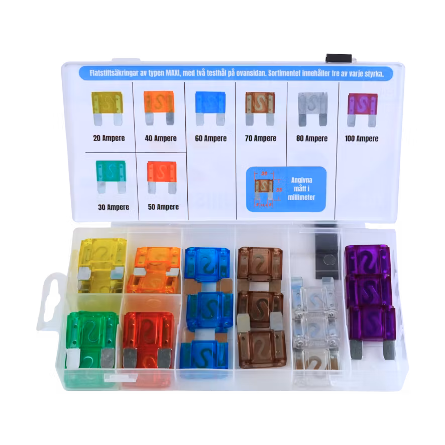 Denna sortimentsats innehåller 24 MAXI-säkringar i olika styrkor från 20 A till 100 A och är perfekt att ha till hands i lastbilen, bussen, båten eller när du bygger din husbil.