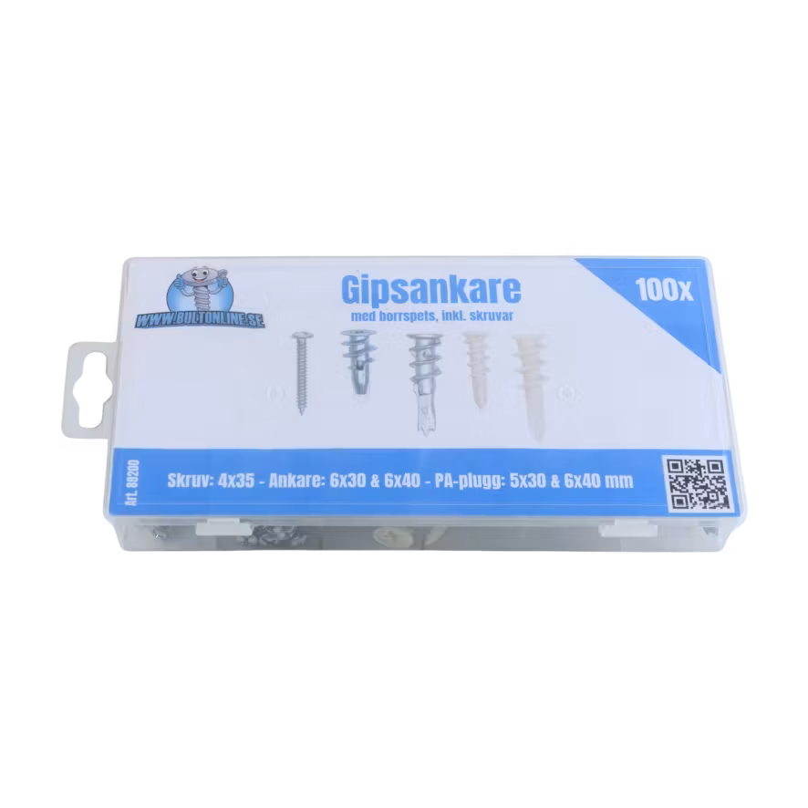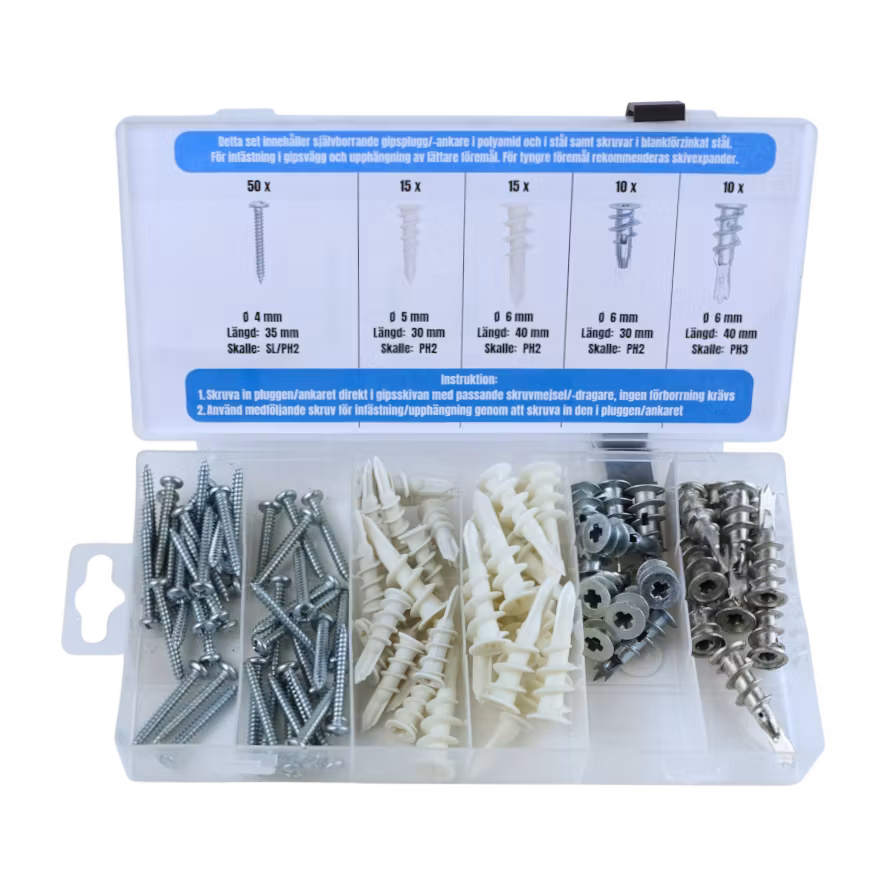 Detta set innehåller självborrande gipsplugg/-ankare i polyamid och i stål samt skruvar i blankförzinkat stål. För infästning i gipsvägg och upphängning av lättare föremål. För tyngre föremål rekommenderas skivexpander.