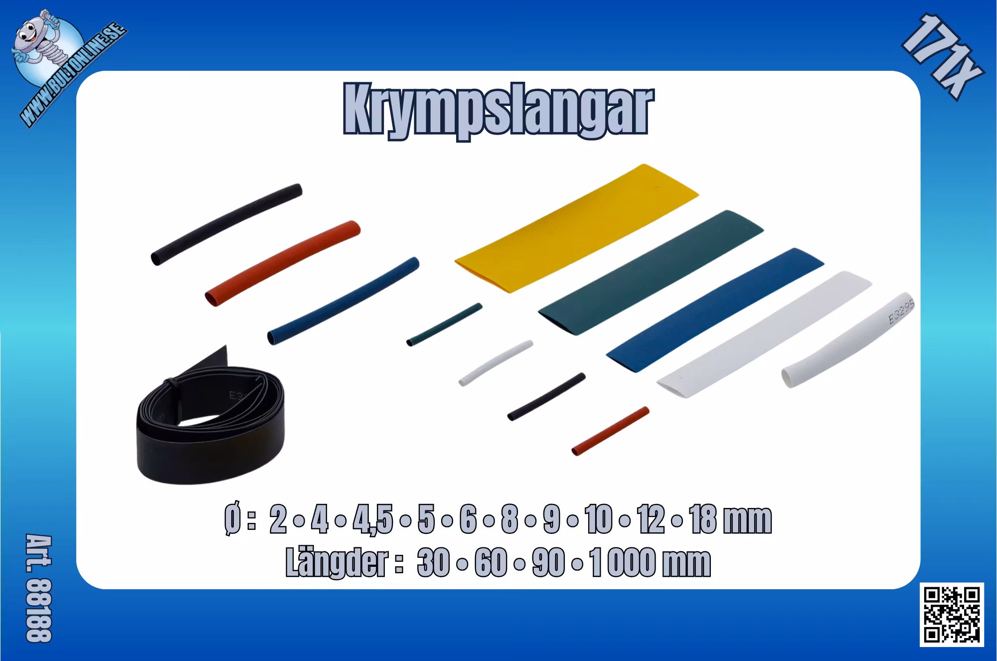 Krympslangar med krympförhållande 2:1. Max 600 V. Max 125° C.