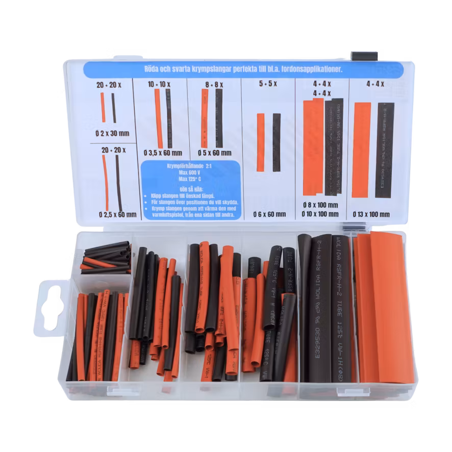 Röda och svarta krympslangar med krympförhållande 2:1. Max 600 V. Max 125° C. Ø mm: 2,0 - 2,5 - 3,5 - 5,0 - 6,0 - 8,0 - 10,0 - 13,0