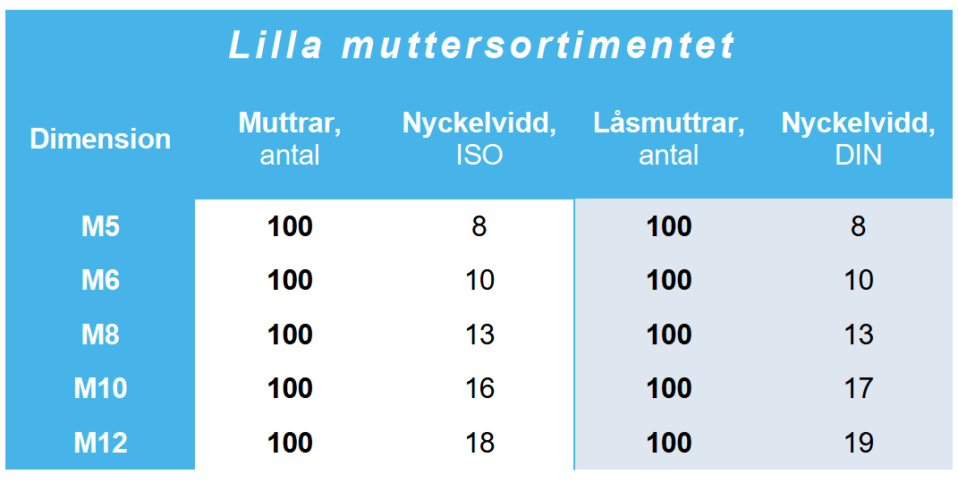 Lilla muttersortimentet är egentligen inte så litet, det innehåller hela 1 000 blankförzinkade muttrar! 500 sexkantmuttrar (ISO 4032) och 500 sexkantlåsmuttrar (DIN 985) i dimensionerna M5 → M12.