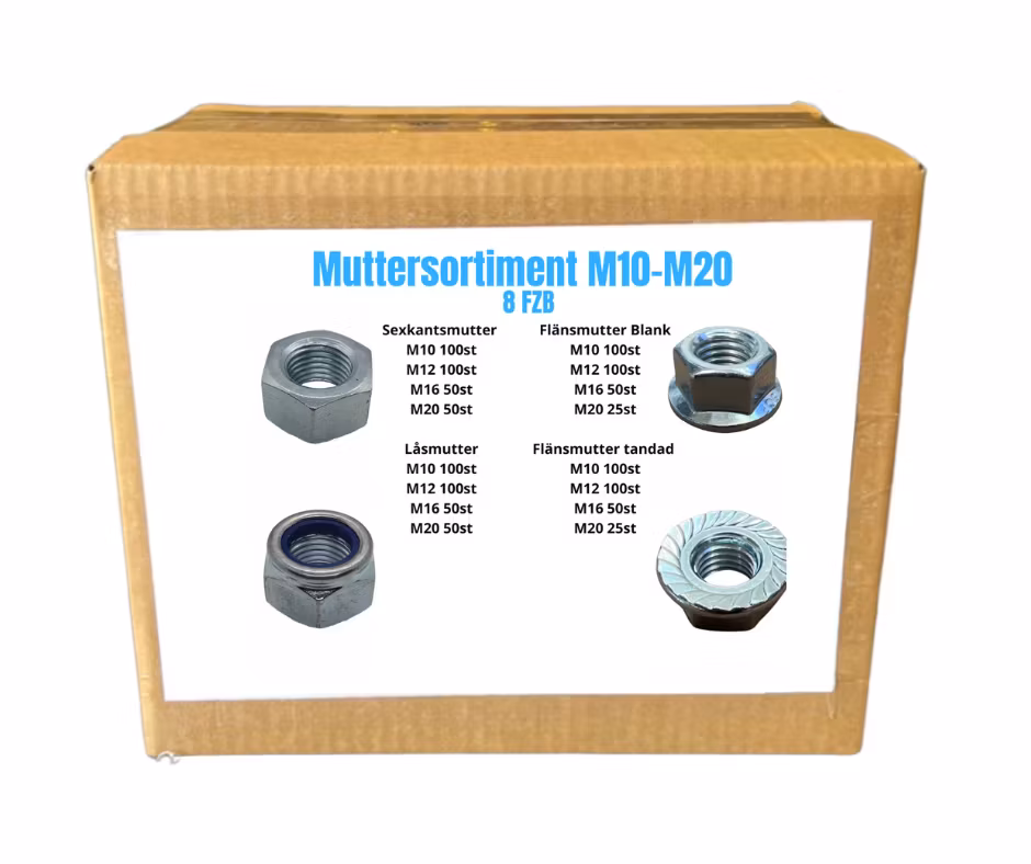 Det är ett utmärkt sortiment som består av sexkantsmutter, Låsmutter, Flänsmutter slät, Flänsmutter tandad  i dimensionerna M10 → M20. Ett sortiment för alla!