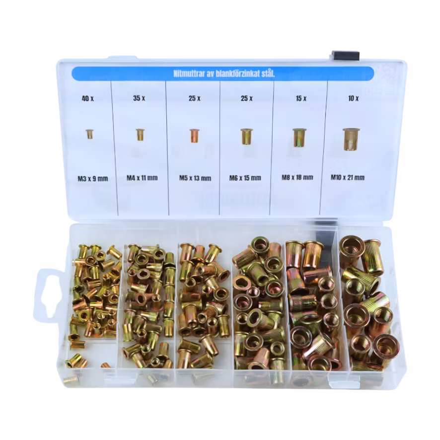 Detta sortiment består av blankförzinkade nitmuttrar i dimensionerna M3, M4, M5, M6, M8 och M10.