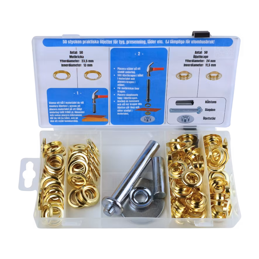Denna kompletta öljettsats innehåller 50 öljettkragar, 50 motbrickor, 1 hålstans, 1 öljettstäd samt 1 slagdon. Innerdiametern på öljetterna mäter ca 12 mm (≈ 1/2").