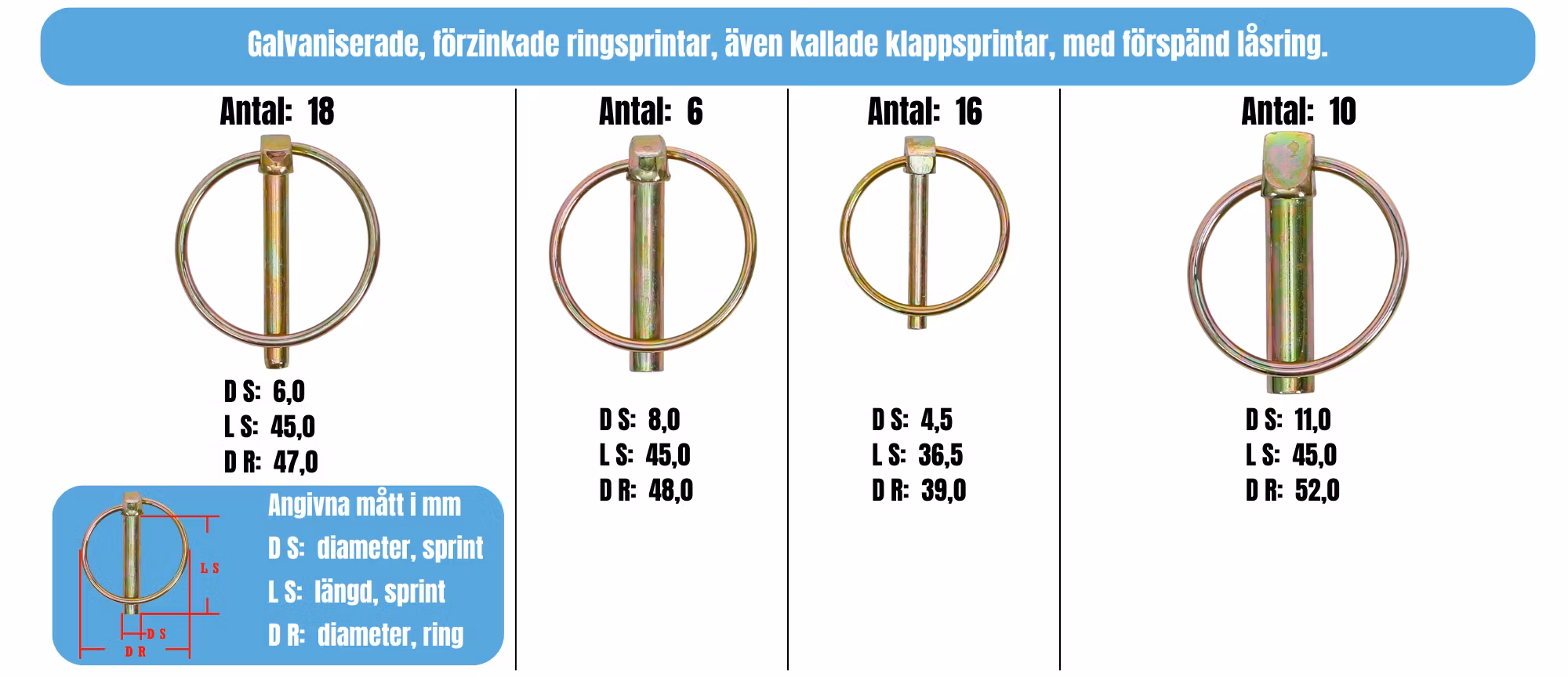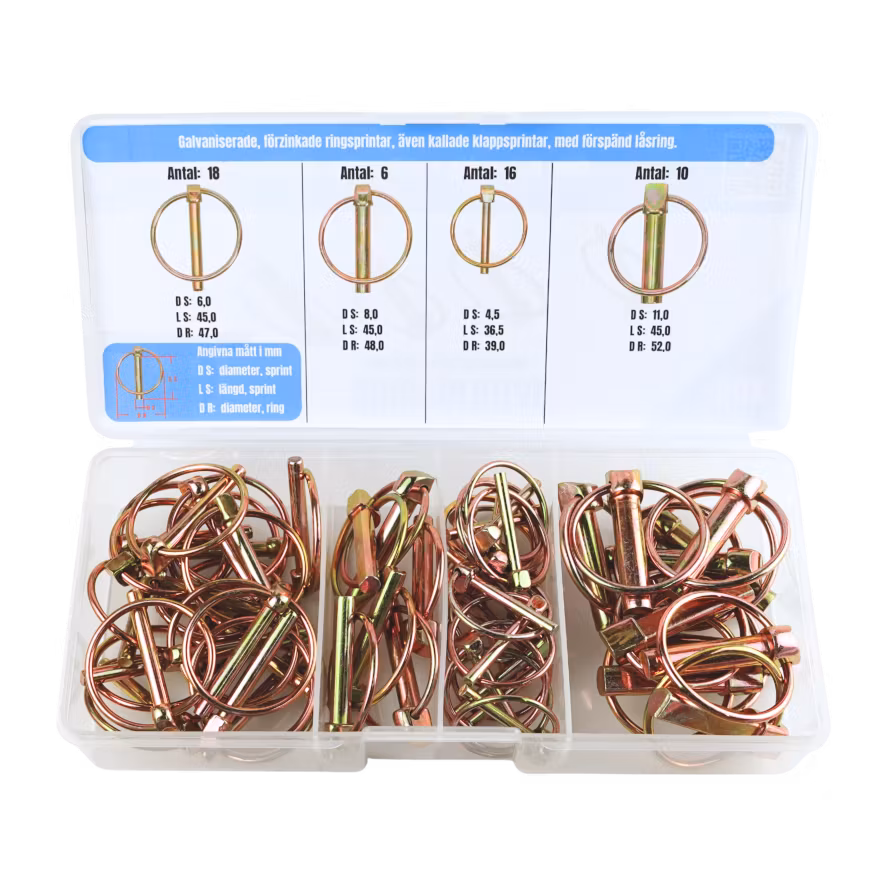 Galvaniserade, förzinkade ringsprintar, även kallade klappsprintar, med förspänd låsring.