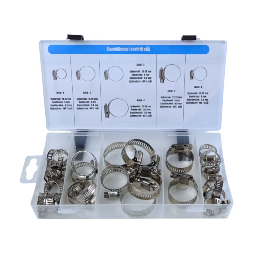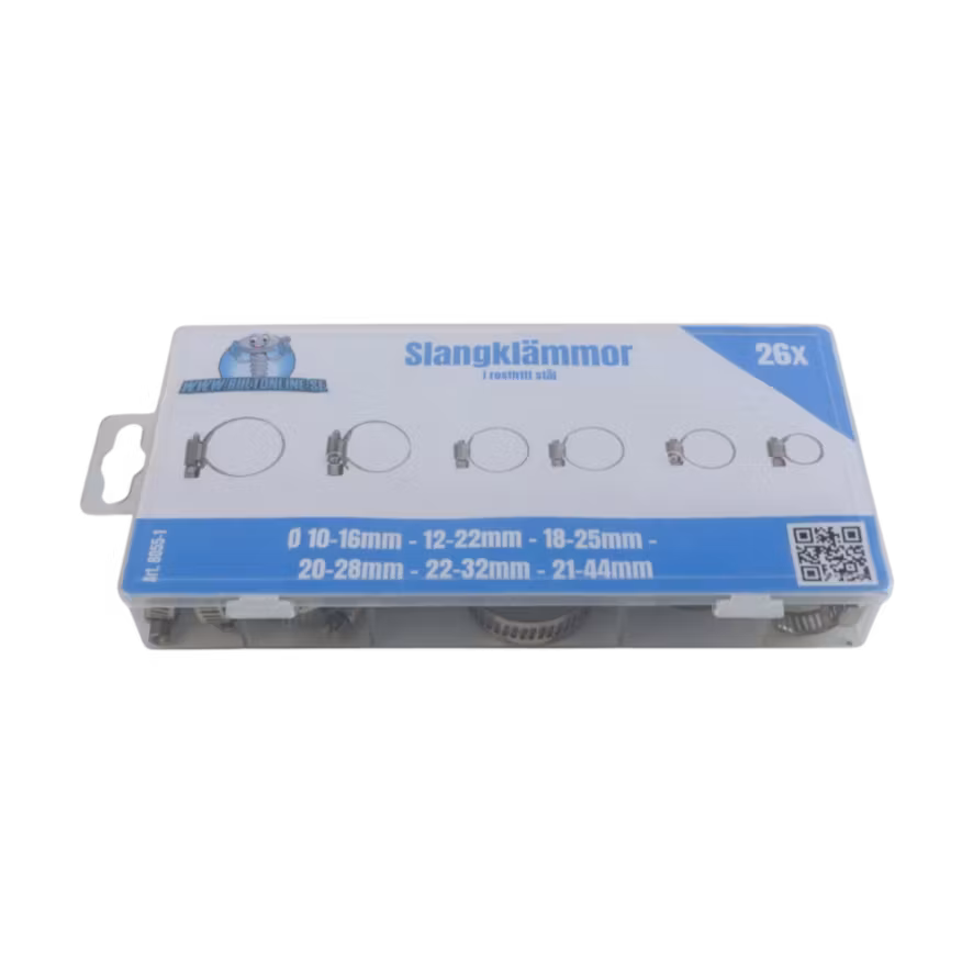 Sortimentsats – slangklämmor, rostfria – 26 delar