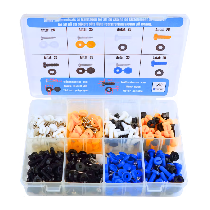 Denna sortimentsats är framtagen för att du ska ha de fästelement du behöver för att på ett säkert sätt fästa registreringsskyltar på fordon. Färgerna - vit, svart, blå, gul - är anpassade till "EU-skyltar". Levereras i praktisk plastlåda.