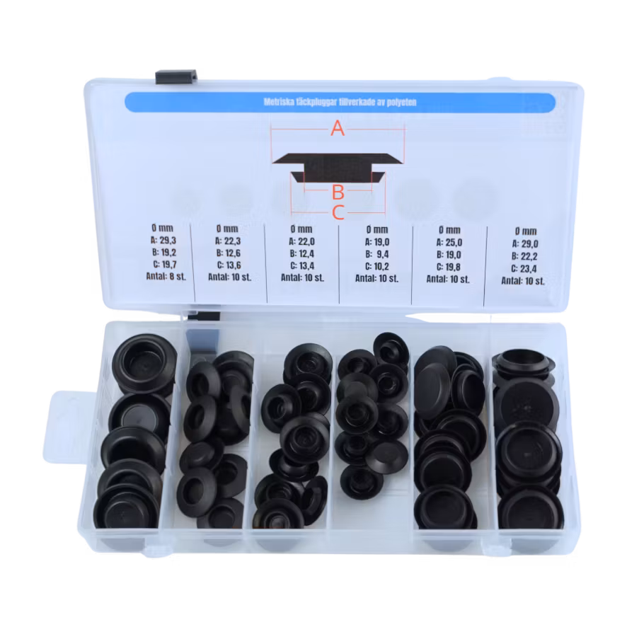 Täckplugg, plastpropp, hålplugg... kärt barn har många namn. Gemensamt är att de är hart när oumbärliga när de väl behövs! De levereras i praktisk plastlåda, som även kan hängas upp.
