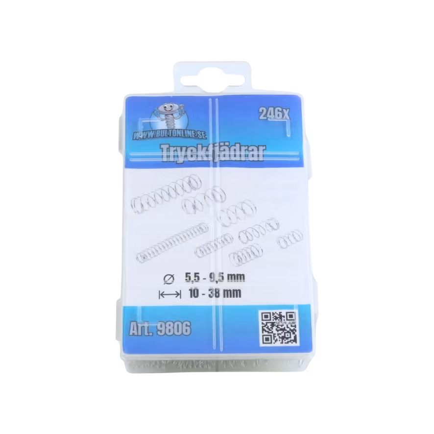 Vår sortimentsats med tryckfjädrar är ett praktiskt grundsortiment att ha till hands. Det innehåller 246 fjädrar i olika dimensioner.