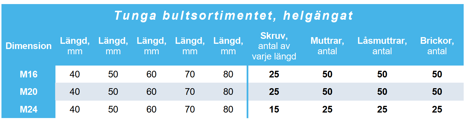 Det tunga sortimentet är särskilt populärt bland åkerier, entreprenadföretag, lantbruk och industrier. Totalt 700 delar blankförzinkad hel o Delgängad sexkantskruv (ISO 4014/4017), sexkantmuttrar (ISO 4032), sexkantlåsmuttrar (DIN 985) samt runda planbrickor (ISO 7089/DIN 125) i grovdimensionerna M16, M20 och M24.