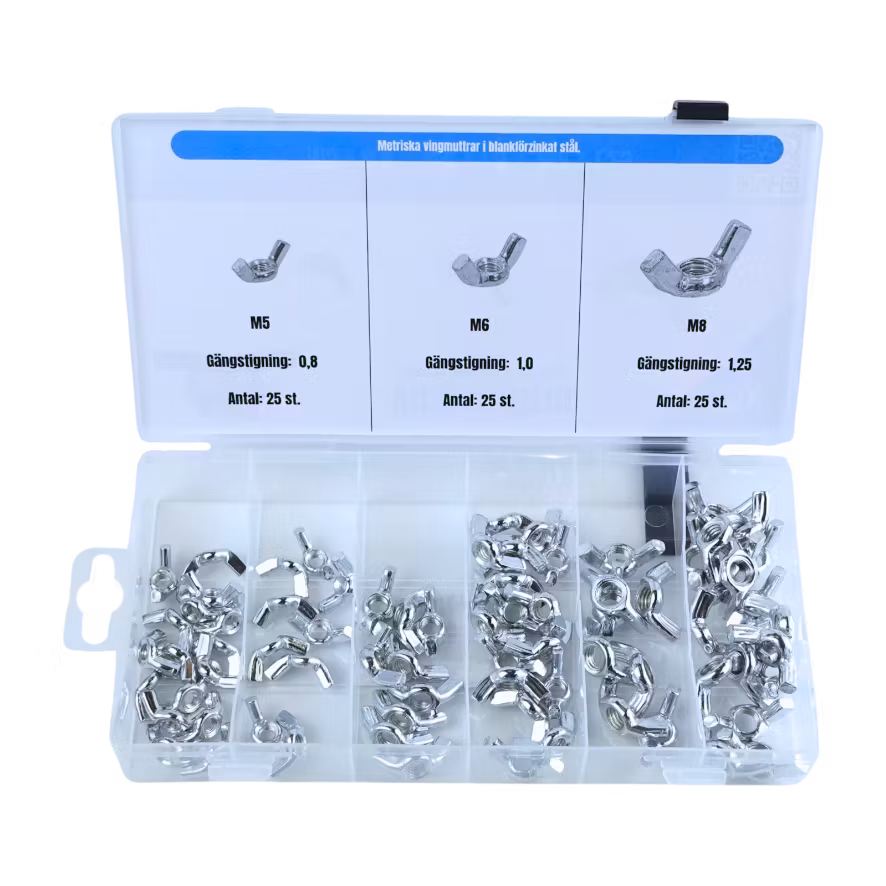 Detta sortiment består av blankförzinkade vingmuttrar i dimensionerna M5, M6 och M8.