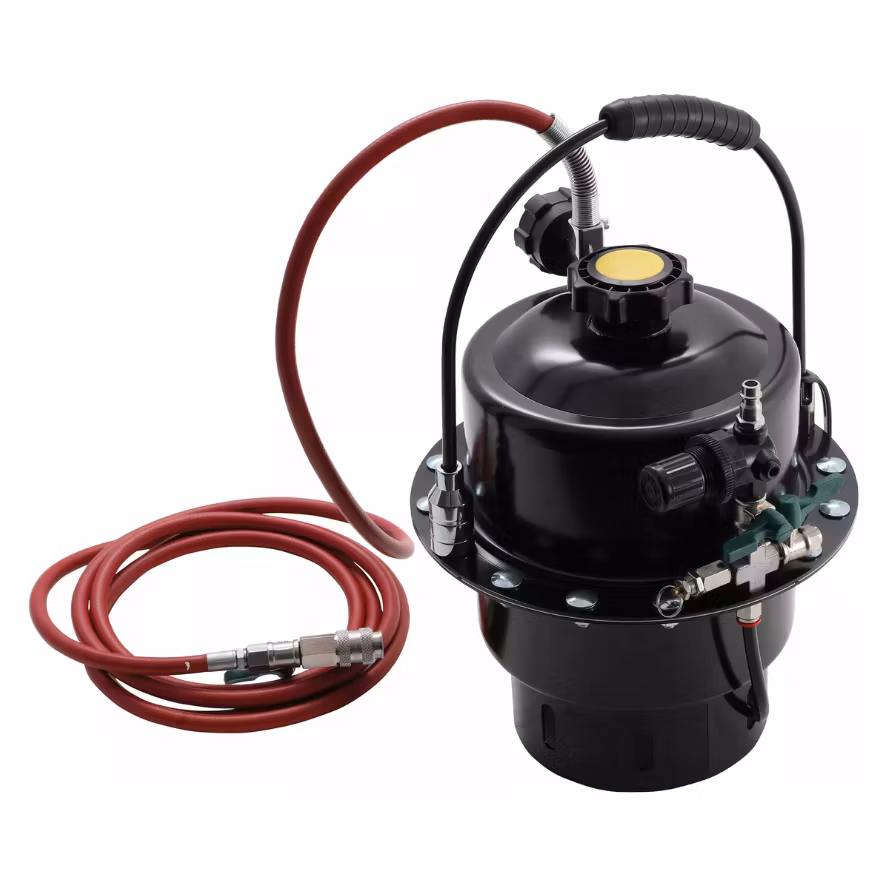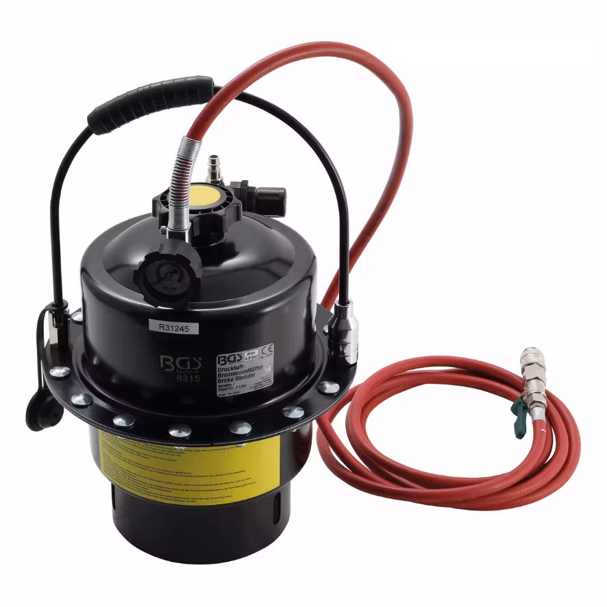 För tryckluftsunderstöd luftning av broms- och kopplingssystemBromsvätska och tryckluft är åtskilda av ett membranArbetstrycket kan regleras 0 - 3 bar med en tryckregulator och avläsas på manometernEuro-snabbkoppling på påfyllnings slangen för lätt montering av adapternAnslutningsslang med snabbkoppling, längd 3,7 mMed säkerhetsventilMått Ø 280 mm, höjd 460 mm5 Liters behållare för bromsvätskaInnehåller en E20 adapter för de vanligaste bromssystemen