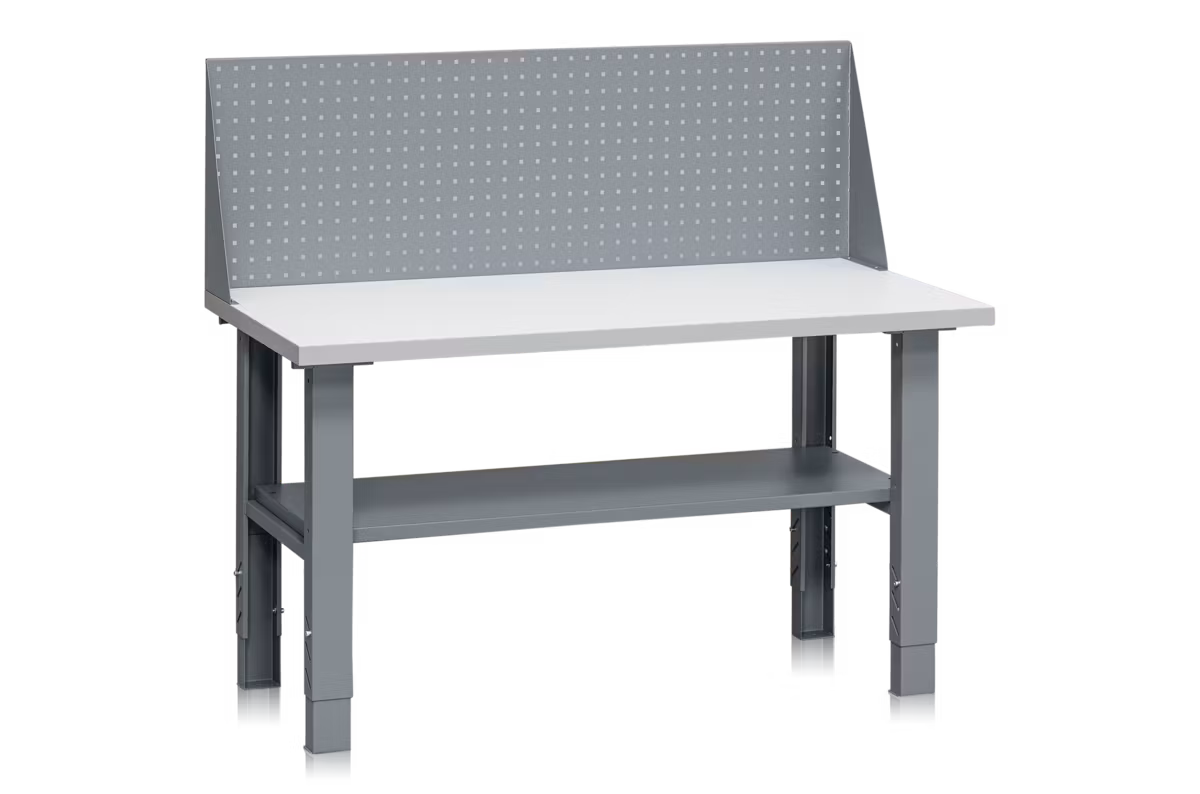 En kraftig arbetsbänk som lämpar sig bäst för monteringsarbete eller i verkstaden. Den 40 mm tjocka bordsskivan i laminat gör bordet väldigt stabilt och kraftfullt, samtidigt som skivan har en hård och reptålig yta med god beständighet mot vätskor och kemikalier. Den 500 mm höga verktygspanelen skruvas fast i bänkskivans bakkant och sidor, för att skapa en anpassningsbar och flexibel verktygsupphängning. Samtliga av våra standardkrokar passar till panelen.
