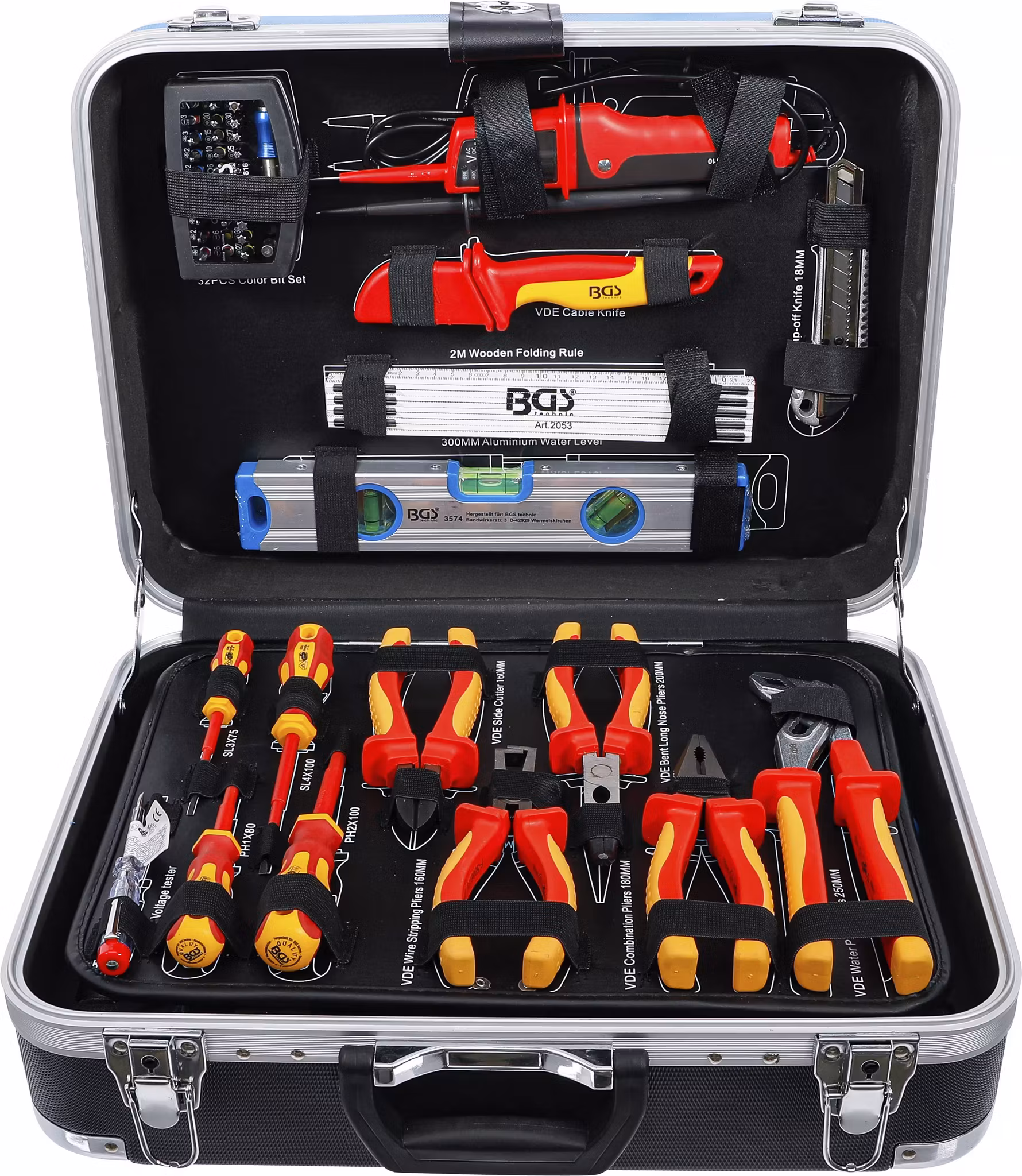 - Hylsor, omställbara spärrhandtag, BGS-tänger, VDE-skruvmejslar och U-ringnycklar tillverkade av kromvanadiumstål