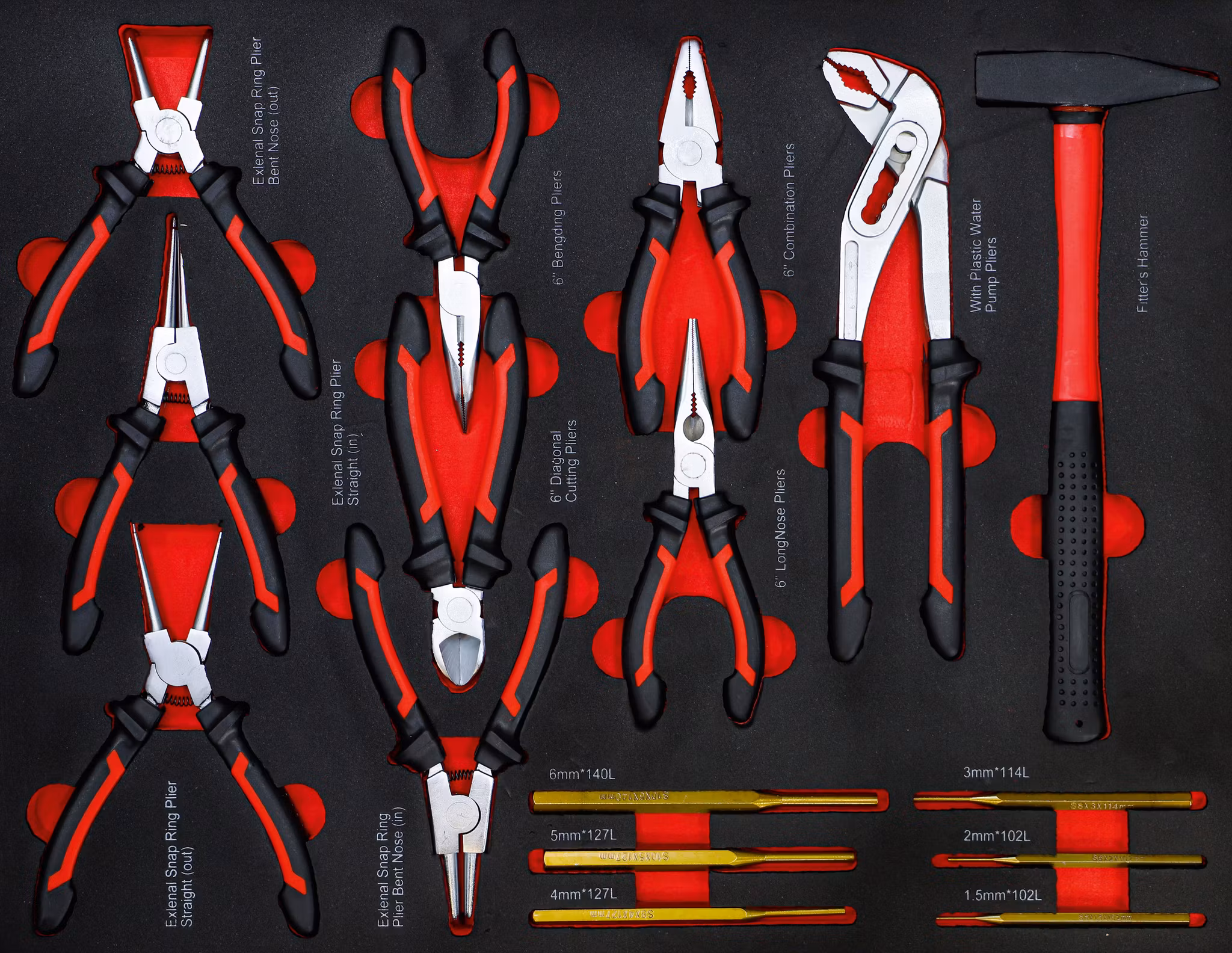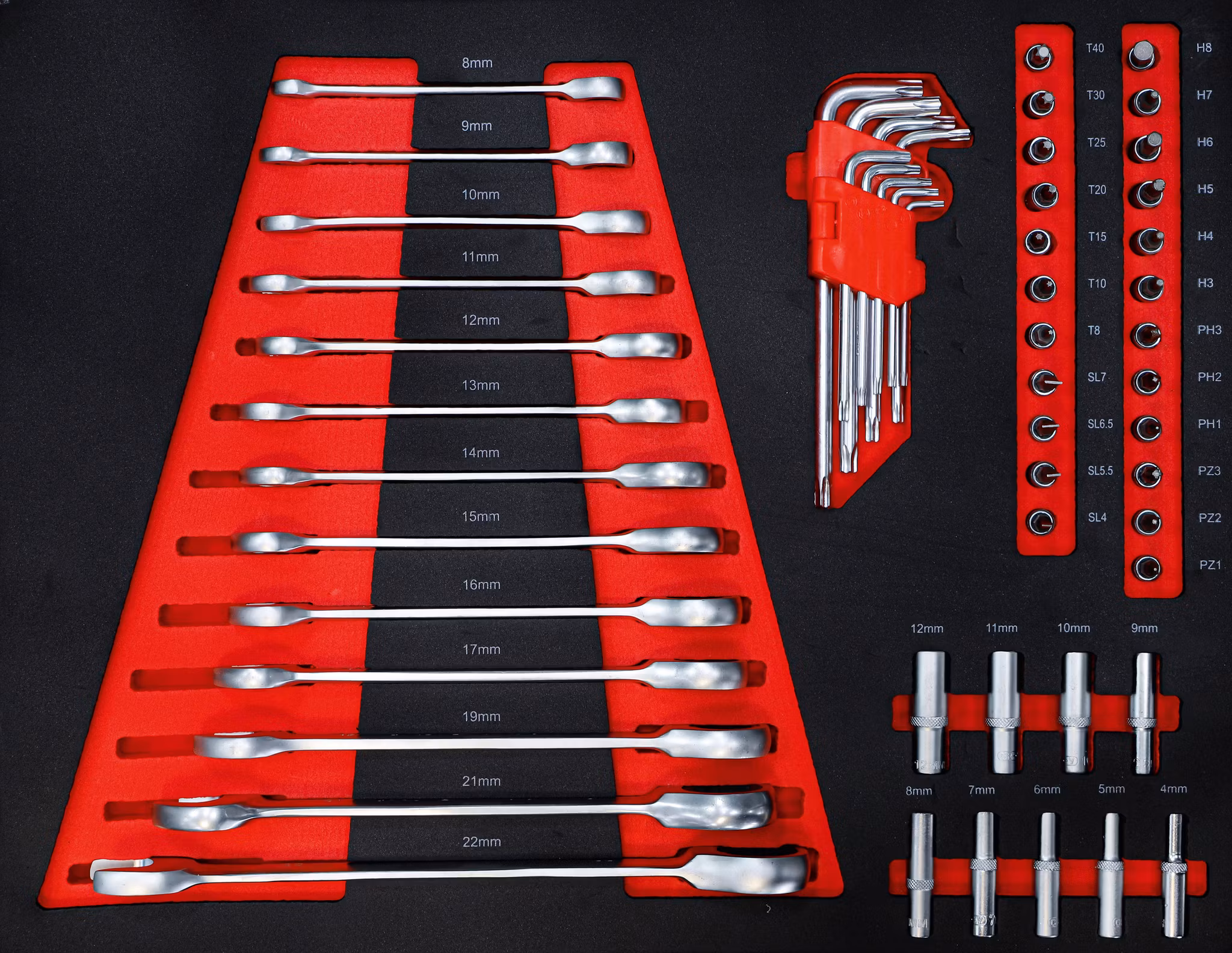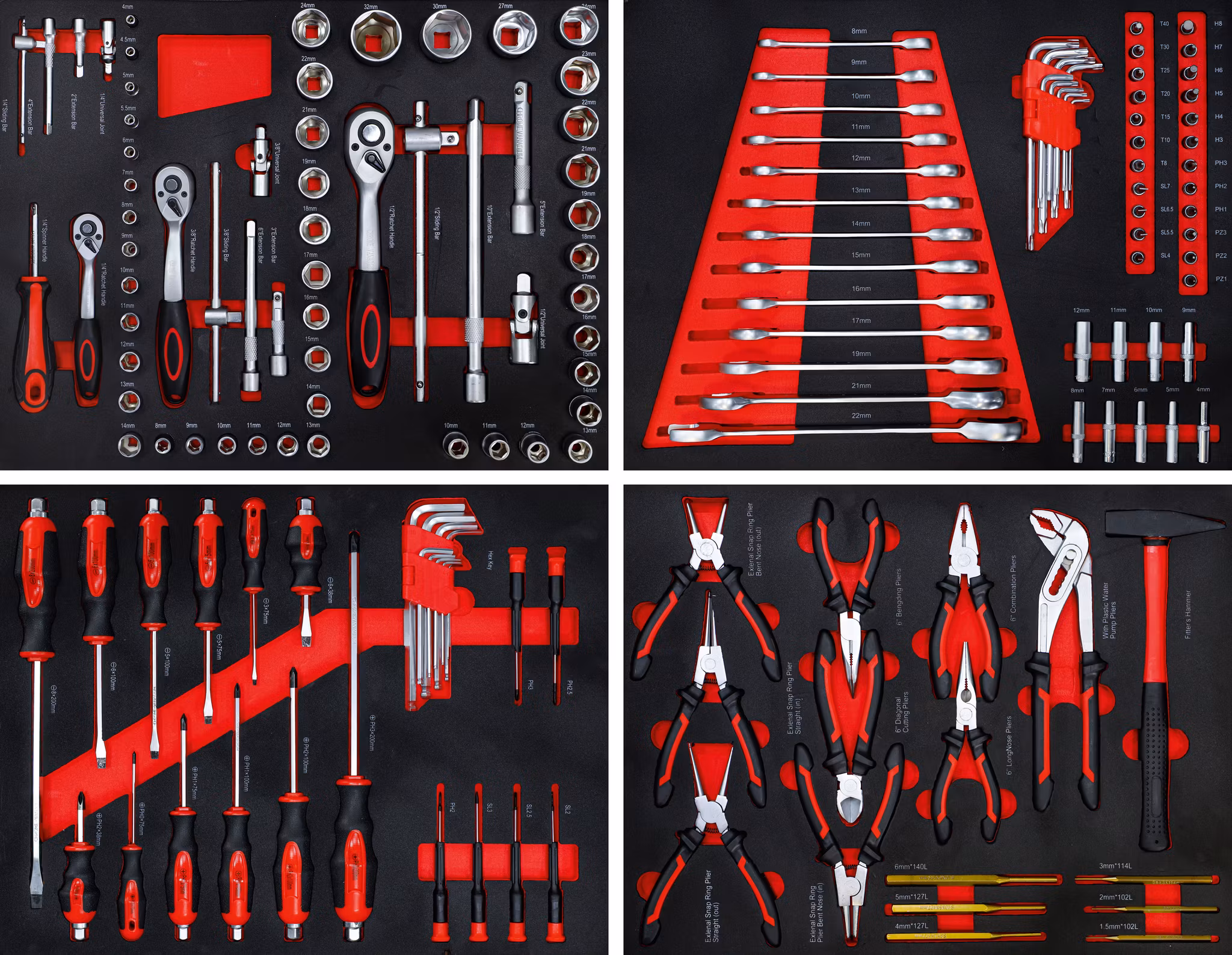 Innehåller 4 mjuka skumplastinlägg med följande verktyg: