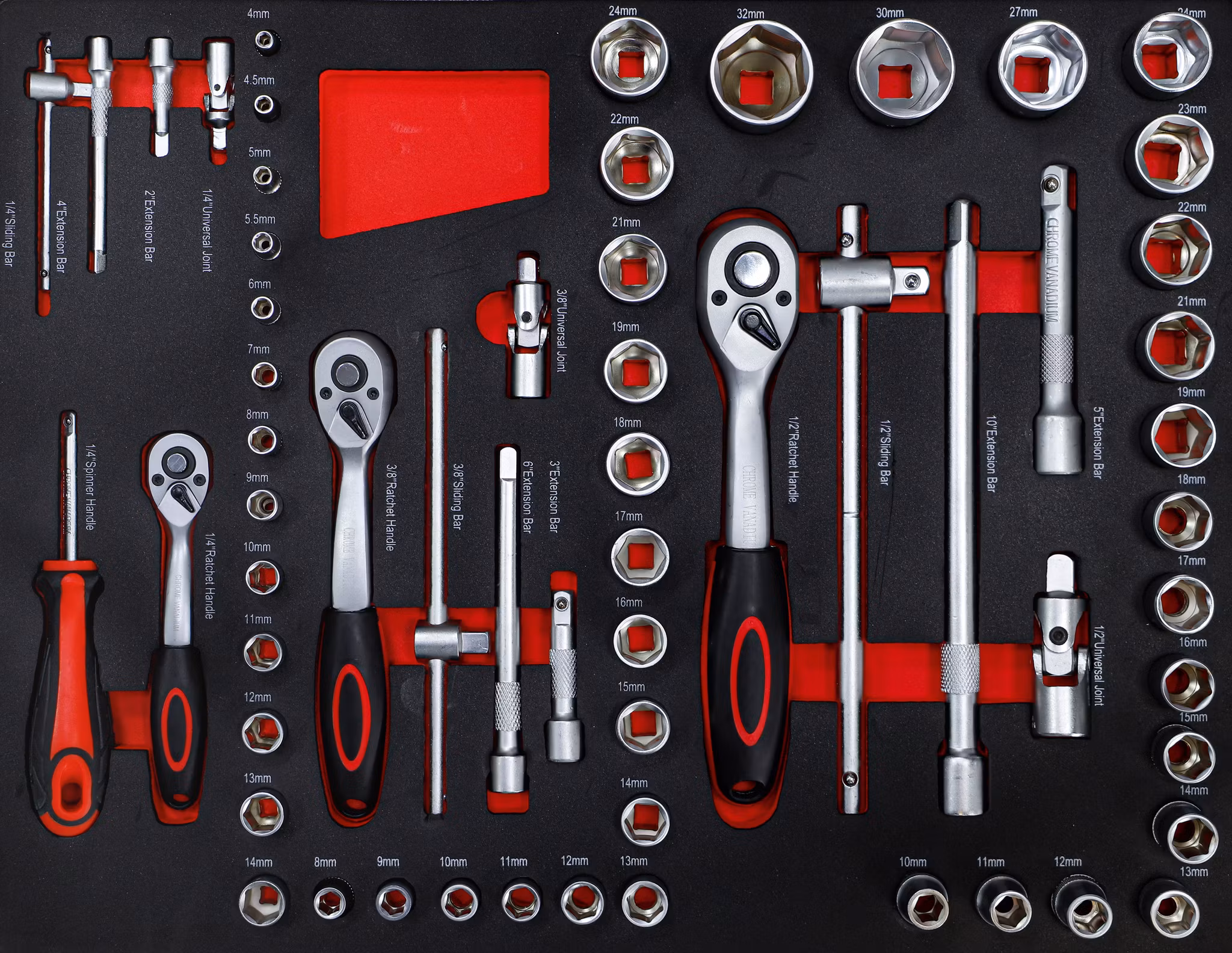 - Hylsnyckelsats, 6,3 mm (1/4"), 10 mm (3/8"), 12,5 mm (1/2"), 61 delar.