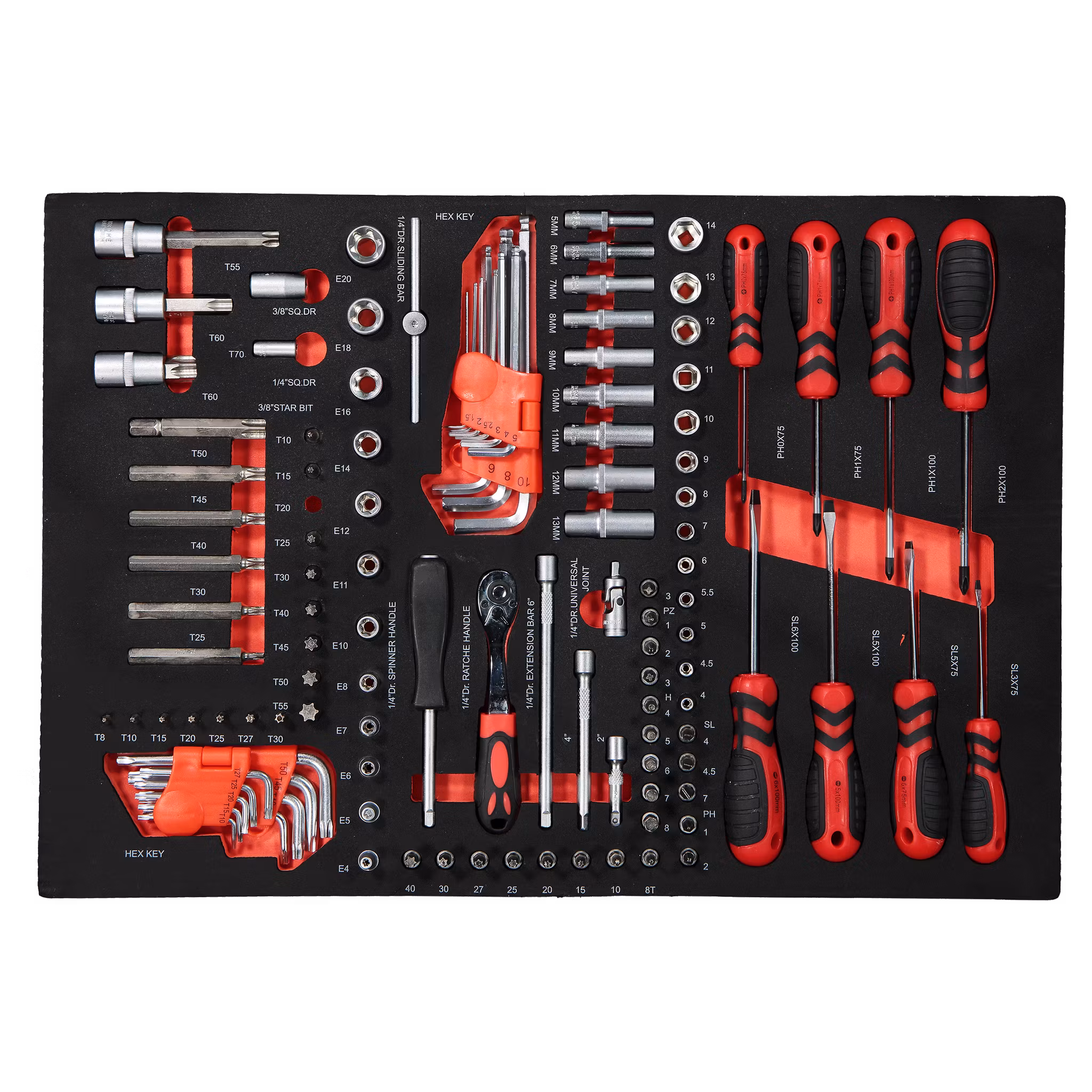Torx-hylsor E10, E11, E12, E14, E16, E18 och E20.